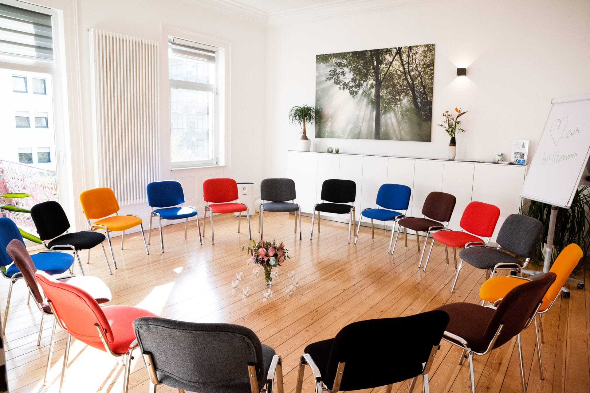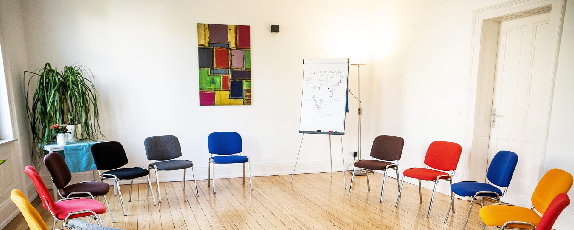 Im ZENTRUM MENSCH stehen Ihnen im Herzen von Wiesbaden ein großer Seminarraum (Raum 1, ca. 40 qm) mit angeschlossener Kommunikationsküche (ca. 19 qm) sowie ein kleinerer Beratungsraum (Raum 2, ca. 18 qm) zur Verfügung.