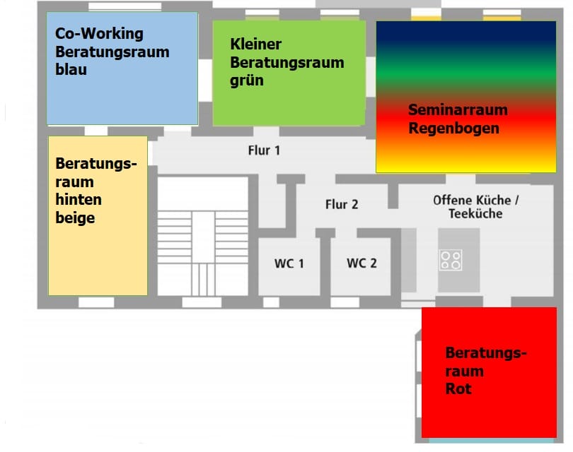 Es kann – je nach Verfügbarkeit – auch die gesamte Etage gebucht werden: Raum 1-5 zzgl. Küche